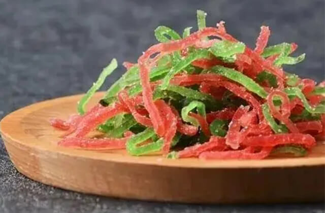 正宗青红丝是用橘柚皮做的,通俗点说就是糖渍染色的陈皮,这样听起来是不是应该不难吃?但是有些廉价青红丝则是用西瓜皮、番木瓜皮、萝卜、甚至冬瓜做的,那这滋味可不是差了点嘛?